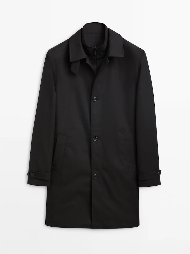 Parte interior acolchada. Cuello con tira abotonada. Cierre mediante botones. Parte interior con cierre mediante cremallera frontal. Dos bolsillos laterales. Bolsillos interiores. Puño con tira abotonada. Bajo con abertura en la parte posterior.