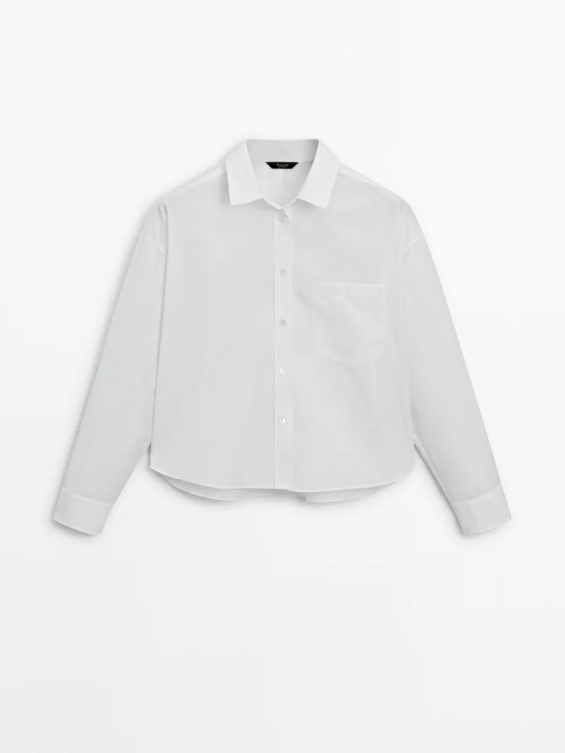 Tejido de popelín. Confeccionado en tejido 100% algodón. Corte cropped. Cierre mediante botones. Un bolsillo insertado a la altura del pecho. Puño abotonado.
